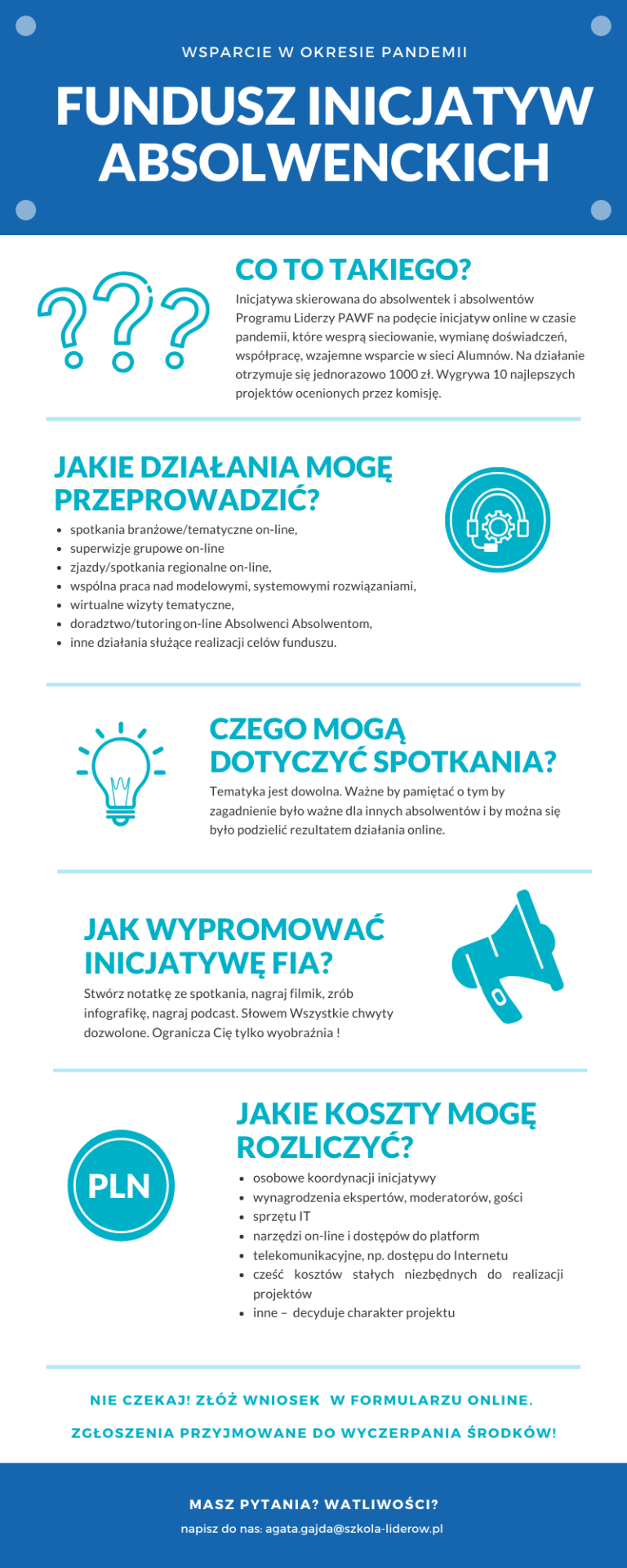 Fundusz Edycja specjalna „Wsparcie w okresie pandemii” przeznaczony jest na dofinansowanie inicjatyw absolwentów i absolwentek Programu Liderzy PAFW, które mają…